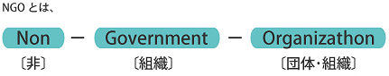 NGOとは、国際連合をはじめとする国際会議などで、民間団体をさすときの名称として使われ始めました。